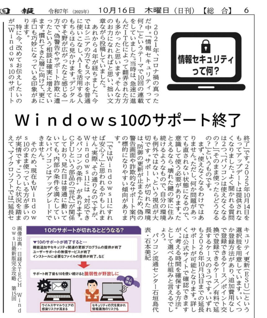 10月16日付の八重山日報に、弊社代表石本が書いたセキュリティコラムが掲載されておりますことをご紹介致します。